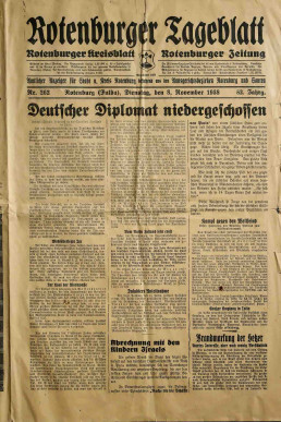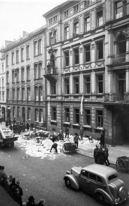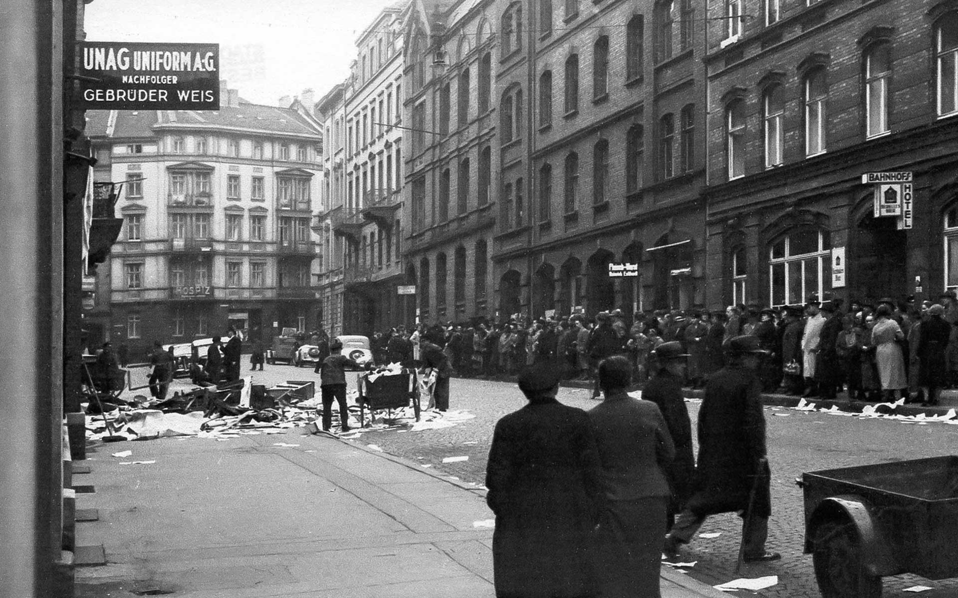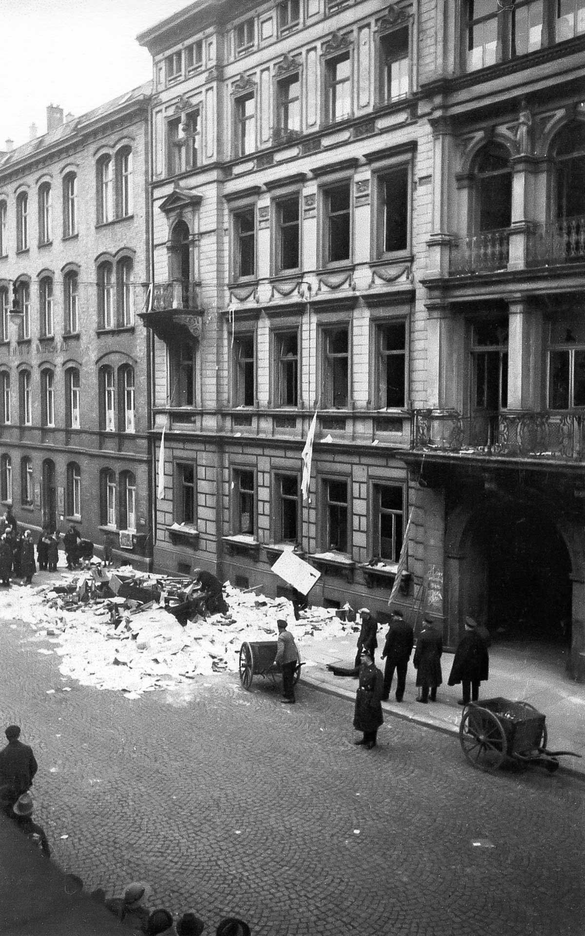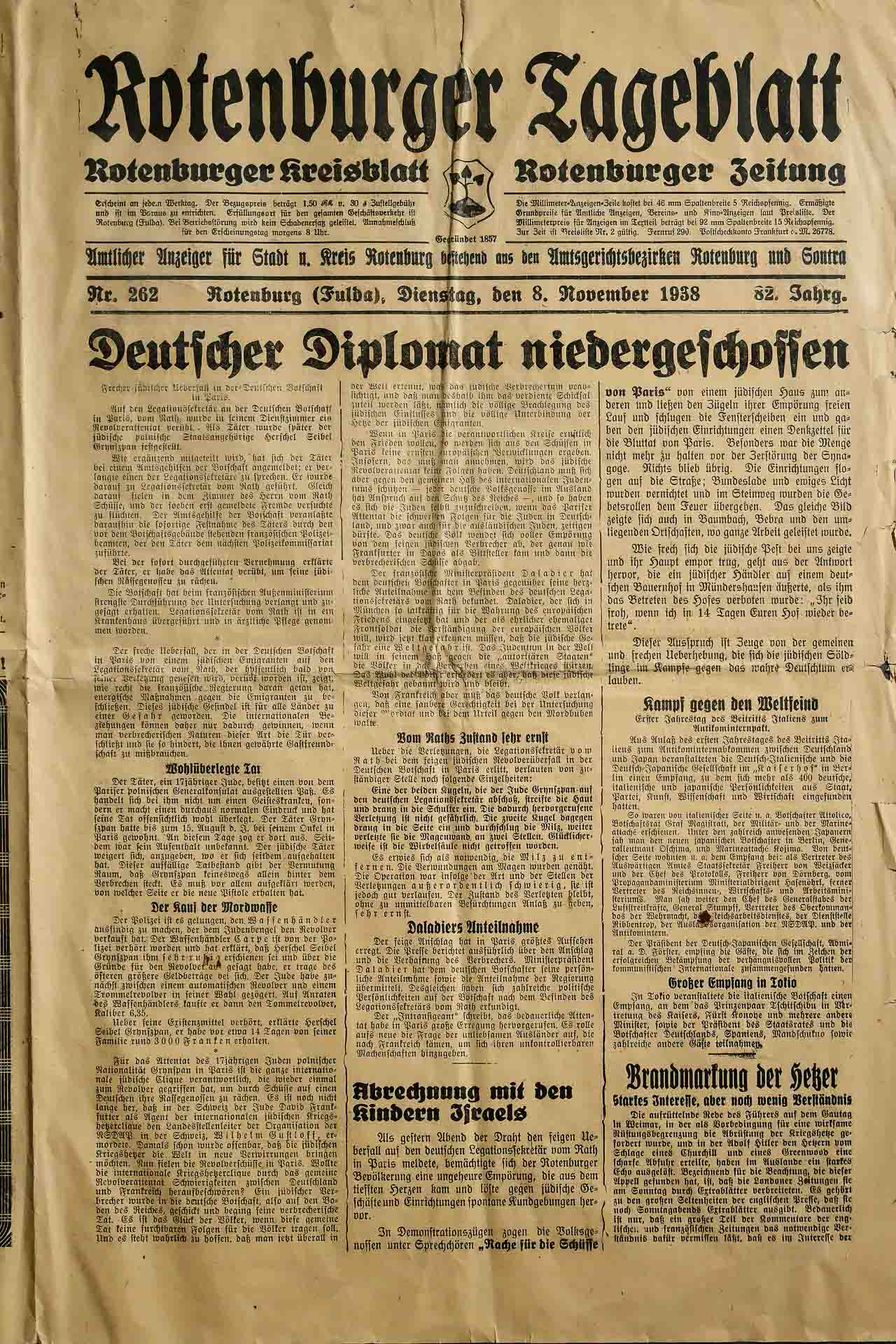 Mai 1933: Bücherverbrennung auf dem Friedrichsplatz. Mai 1933: Bücherverbrennung auf dem Friedrichsplatz. 1. April 1933 auf dem Friedrichsplatz: Eine Menschenmenge bestaunt einen in Stacheldraht eingezäunten Esel. Dazu stand auf einem Plakat: „Konzentrationslager für Staatsbürger, die noch bei Juden kaufen“. Der eingezäunte Esel auf dem Friedrichsplatz. Vor Kopf ist der Kaufhof zu sehen. Nach einer Verordnung vom 5. Oktober 1938 erhielten Juden entweder neue Pässe – oder ihre Pässe wurden mit einem großen „J“ per Stempel versehen. Der 17-jährige Herschel Grynszpan, der auf Ernst Eduard vom Rath geschossen hatte. Der deutsche Diplomat Ernst Eduard vom Rath, auf den am 7. November 1938 Herschel Grynszpan ein Attentat verübte. Vom Rath erlag seinen Verletzungen am 9. November 1938. So berichtete die Nazi-Presse über das Attentat auf vom Rath. Eine Zeichnung der 1839 eingeweihten Synagoge. 99 Jahre später endet ihre Geschichte. So sah die Kasseler Synagoge innen aus. Nach den Pogromen: Viele Menschen wollen sehen, was an und in der Synagoge passiert ist. Zum Zeitpunkt, als das Foto entstand, war jedoch schon aufgeräumt worden. Nach den Pogromen: Viele Menschen wollen sehen, was an und in der Synagoge passiert ist. Zum Zeitpunkt, als das Foto entstand, war jedoch schon aufgeräumt worden. Blick von der Empore der Synagoge. Blick von der Empore der Synagoge. Nach den Pogromen beschloss die Kasseler Stadtverordnetenversammlung den Abriss der Synagoge. Schaulustige betrachten die Schäden, die am 7. November am Gemeindehaus in der Großen Rosenstraße in Kassel angerichtet worden waren. Das Gemeindehaus in der Großen Rosenstraße nach den Pogromen. Das Gemeindehaus in der Großen Rosenstraße nach den Pogromen. Das Gemeindehaus in der Großen Rosenstraße nach den Pogromen.